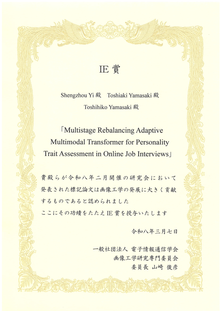 【プレスリリース】「面接時の人物に対する評価AI」における研究成果がIE賞(電子情報通信学会 画像工学研究会)を受賞 〜Multistage Rebalancing Adaptive Multimodal Transformer for Personality Trait Assessment in Online Job Interviews〜